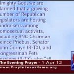 Let us pray. Almighty God, we are alarmed that a growing number of Republican legislators are hosting fundraisers among homosexual activists, including RNC Chairman Reince Priebus, Senator John Cornyn (R-TX), and Congressman Pete Sessions (R-TX), who “all did fundraisers in the 2010 cycle with the national gay and lesbian GOP grass-roots organization, Log Cabin Republicans.” …